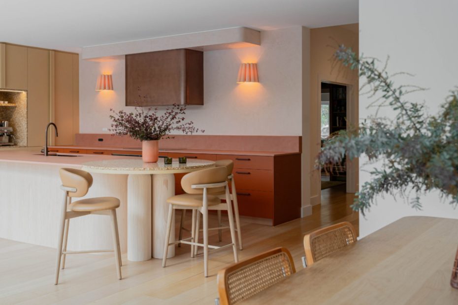 Terrazzo accents on the extended bench and coffee nook reflect these tones, complemented by a Dekton umber island bench, Venetian plaster rear wall, and bronze rangehood.