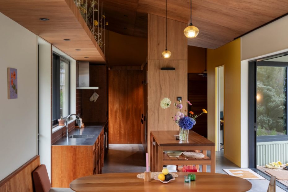 These details are layered with deliberate pops of colour that feel like a breath of fresh air as you move through the house. The exterior reveals soft green steel cladding and dark timber, while windows and openings are brightened by the operable awnings in a cheerful yellow fabric, aligning to significant landmarks in the valley.