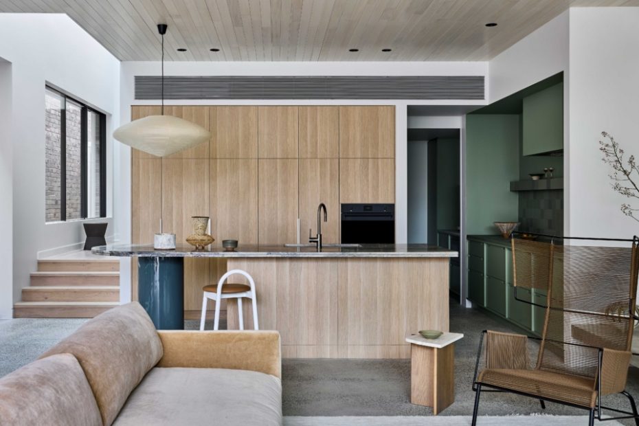 In the kitchen, polished concrete floors are paired with warm timbers and green tiles, while windows capture glimpses of the sky and the neighbouring red brick building — adding an extra layer to the home’s robust aesthetic.