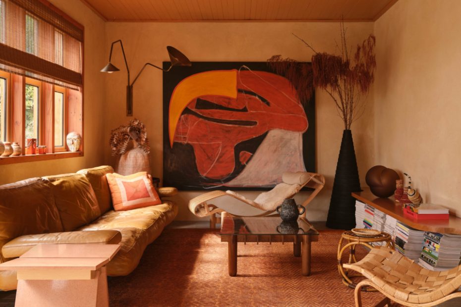 Rug by Loom. Artwork by Ted May. Custom wall light by Volker Haug. Large black timber vessel by Tom Dixon. Tokyo Chaise by Charlotte Perriand for Cassina. Kyoto coffee table by Gianfranco Frattini. Terrazzo side table by Thomas Coward. Vintage Grand Italia sofa by Lomazzi-De Pas-D’Urbino for Zanotta. Chair by Bruno Mathsson. Basket and face mask from Pan After. Glass blown lamp by Misseu.
