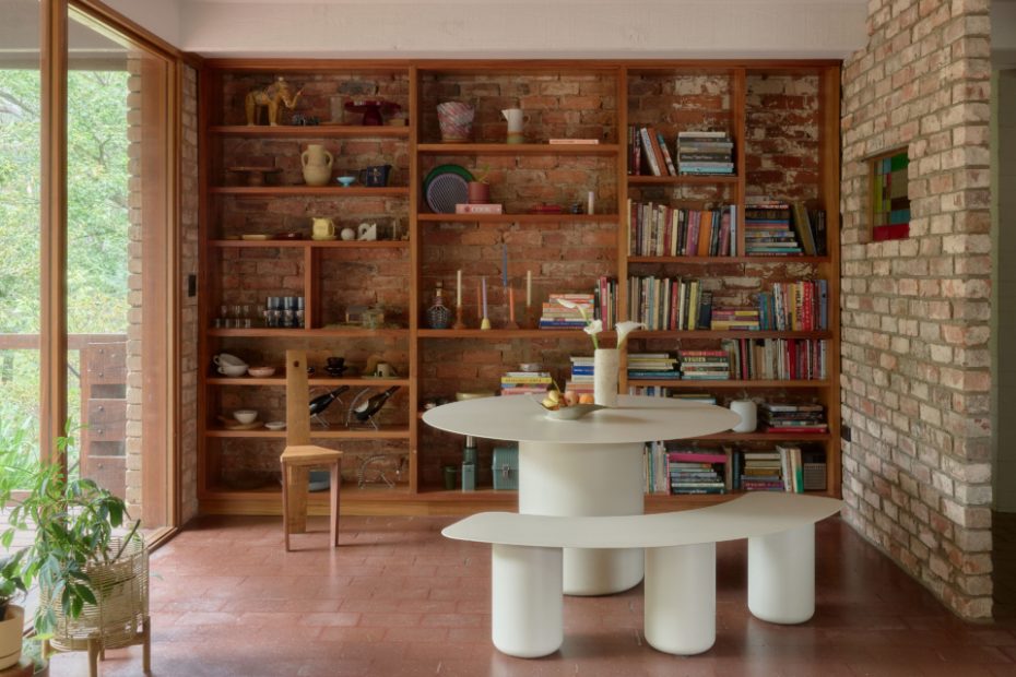 ‘The Guseli pool, wood-framed windows and the gum trees drew us in,’ says Lauren. ‘When I first walked in and saw the stained glass windows, the deck, the brick details, and the incredible view over the dam and the river, I fell in love.’