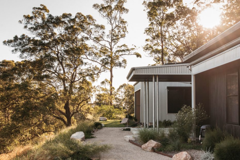 The main exterior material is Zincalume, selected for its heat reflectivity, bushfire resilience, and minimal upkeep.