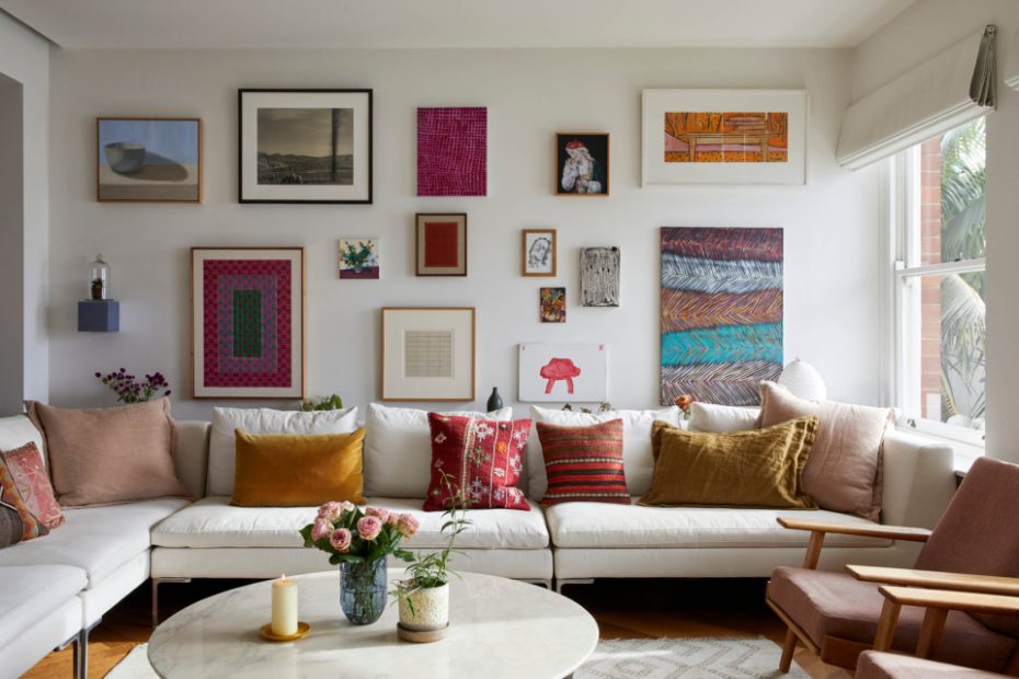 Emily’s living room doubles as a showroom. The gallery wall is made up of pages from old magazine issues, framed by Frames Readymade and hung by Alex Hangs. Photo – Eve Wilson. Editorial Styling – Sarah Hendriks.