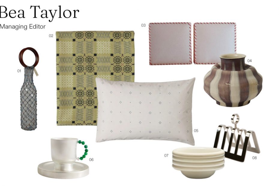 01. Tanchen 0/0 Bag – Blue Brown from Pépite. 02. Melin Tregwynt Welsh Blanket from Toast. 03. LE SQUARE Stitched in Red Sconces from Petite Motif. 04. Amn Ceramics Vase. 05. Rowan Print Cotton Poplin Housewife Pillowcase Set from Toast. 06. Natalia Criado Perlina silver-plated brass and quartz teacup and saucer set from Net-A-Porter. 07. Breakfast Bowls in Marshmallow from Softedge Studio. 08. David Mellow Toast Rack from Morning Market.