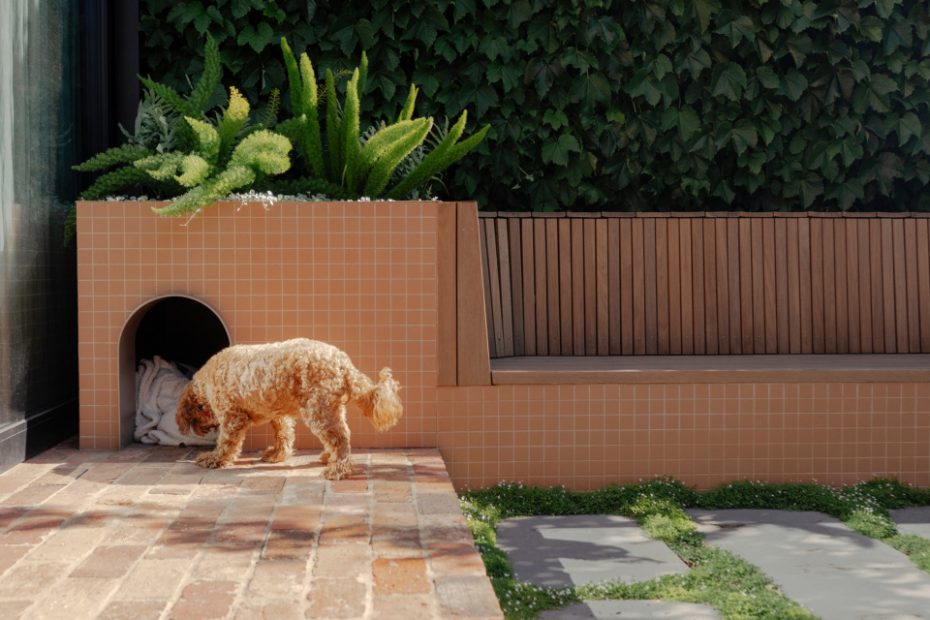 The seating area features terracotta tiles, timber backing, and a built-in pet nook.