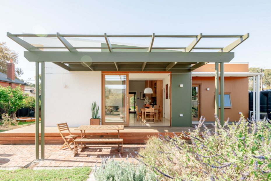 Terracotta tiles and pops of green reference the cottage’s original palette, as sliding doors open to the outdoor dining space with matching colours on the exterior and pergola.