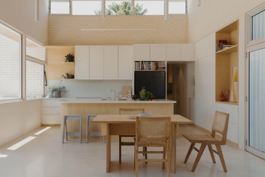 Lofty ceiling rest above the open-plan living, dining and kitchen.