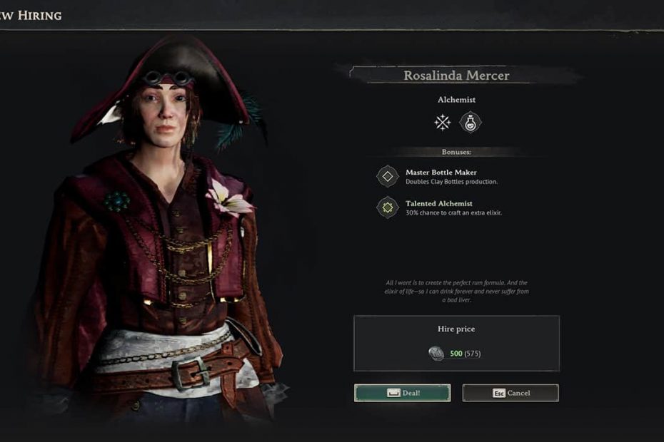Rosalinda is a fantastic addition to your crew. She brings two powerful crafting bonuses. Master Bottle Maker (which doubles Clay Bottle production) and Talented Alchemist (which provides a 30% bonus to craft additional Elixirs). Clay Bottles are a vital component for healing supplies later in the game, so she’s well worth recruiting.