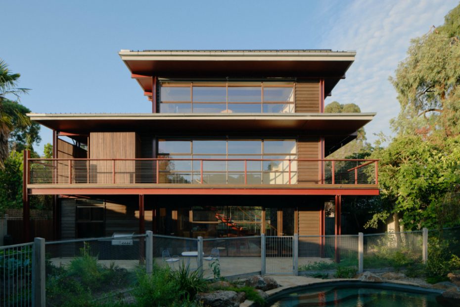 Despite its 90’s origins and later addition, when Breathe architects were invited to envision a new chapter for the home, they felt it radiated a distinctly modernist energy, with its floor-to-ceiling timber-framed windows, flat rooflines, and red steel beams.