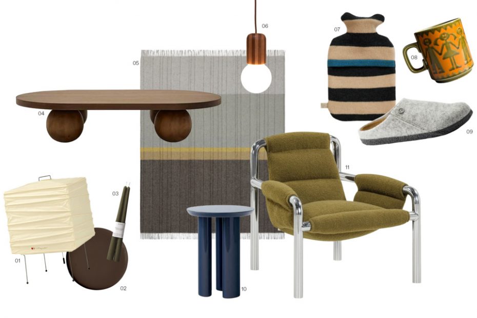 01. Akari 3X from In Good Company. 02. Batch Brew paint from Tint. 03. Tapered Candle Pair in Olive from L&M Home. 04. Yoko Coffee Table in Walnut from Ellison Studios. 05. Waverley Mills Wool Throw Terrain in Cradle Mountain from Simple Beautiful Things. 06. Oscillate Pendant from Sundown Lighting. 07. Lambswool hot water bottle cover from Etsy. 08. Vintage mug from Etsy. 09. Zermatt Anthracite Wool Felt Slippers from Birkenstock. 10. Tung Side Table JA3 from Cult. 11. Atli Lounge Chair from Trit House.